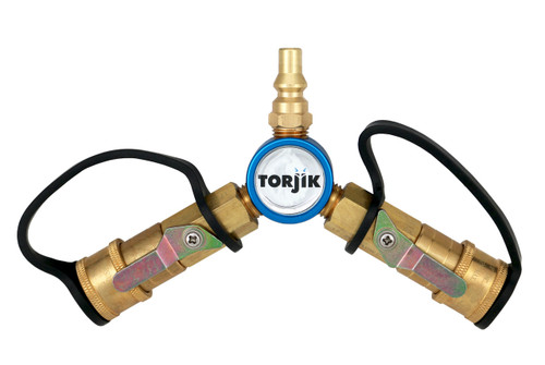 The Torjik QUICK•Y+ is an enhanced version of the TOP-SELLING Torjik QUICK•Y. This incredibly handy fitting allows two low-pressure appliances to be easily connected to the quick-connect output fitting on your RV and the QUICK•Y+ has the added feature of shut-offs on each female quick-connect. Using the QUICK•Y+ is easy, just connect the male end to the standard female quick-connect port found on most RV's. Now you have TWO female quick-connects available! Pair the QUICK-Y with 2 standard 8' Quick Connect Appliance Hose or have us build any custom length hose you need. The QUICK-Y+ is equipped with 1 standard type 250 male quick-connect and 2 standard type 250 female quick-connects with shut-offs. The Torjik QUICK-Y is a heavy-duty, purpose built fitting. If you spend time in your RV, whether it be camping, tailgating or at an RV park, you will LOVE the Torjik QUICK•Y+.